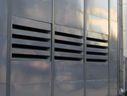百叶式消声器一般消声量为10~20dB(A),消声频带较宽,能满足通风散热、采光及围护等要求。百叶式消声器的消声性能主要决定于单片百叶的形式、百叶间距、安装角度及有效消声长度等因素。通风消声百叶可设计成窗式结构,根据使用环境不同可采用不锈钢、优质铝合金、镀锌钢板等材料制成。
